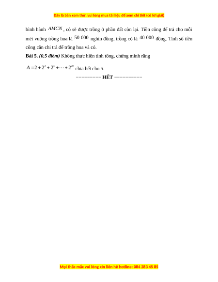 Bài 5. (0,5 điểm) Không thực hiện tính tổng, chứng minh rằng chia hết cho 5.