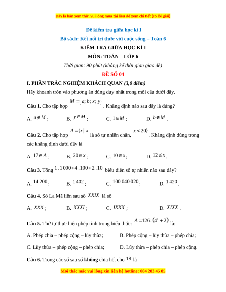 - Tailieugiaovien.com.vn giới thiệu bộ đề thi giữa kì 1 Toán 6 Kết nối tri thức mới nhất năm 2023 nhằm giúp Giáo viên có thêm tài liệu tham khảo ra đề thi Toán lớp 6. Bộ đề thi Toán 6 Giữa kì 1 gồm 10 đề thi có ma trận + lời giải chi tiết.