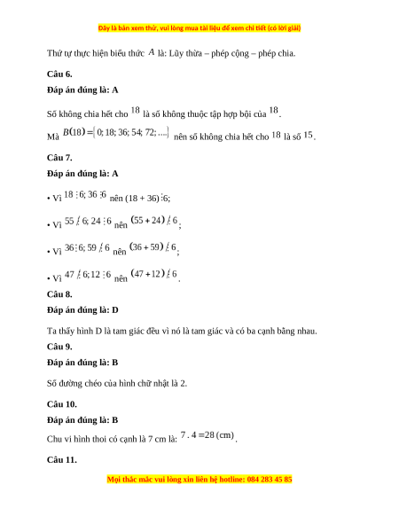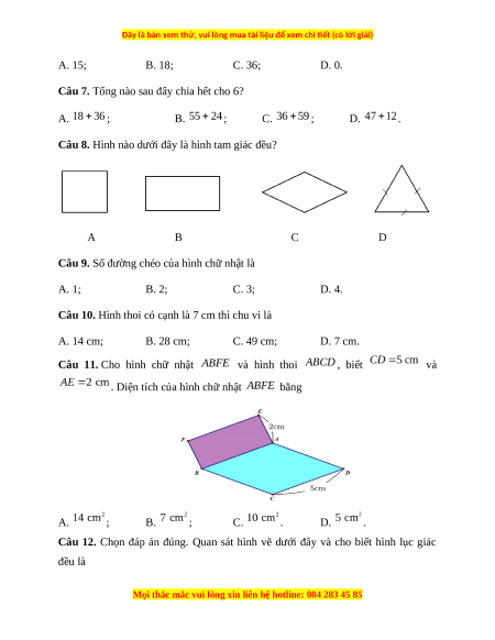 Câu 7. Tổng nào sau đây chia hết cho 6? A. ; B. ; C. ; D. .