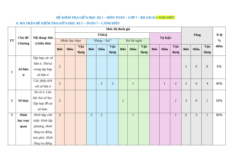 A. MA TRẬN ĐỀ KIỂM TRA GIỮA HỌC KÌ 1 – TOÁN 7 – CÁNH DIỀU Mức độ đánh giá TNKQ Tổng Tỉ lệ