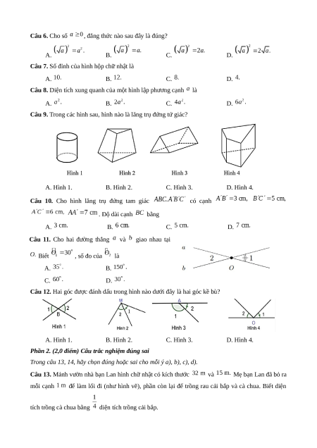 học trực nhật. Hình lập quan phương. Hình lăng trụ đứng tam giác. Hình lăng trụ đứng tứ giác. Góc. Đường Góc ở vị trí 3 thẳng 2 1 2 1 0 10% đặc biệt. song song Tổng số câu 12 2 4 2 1 3 1 4 15 8 6 29 Tổng số điểm 3,0 2,0 2,0 3,0 4,0 3,0 3,0 10,0 Tỉ lệ % 30 20 20 30 40 30 30 100 Lưu ý: