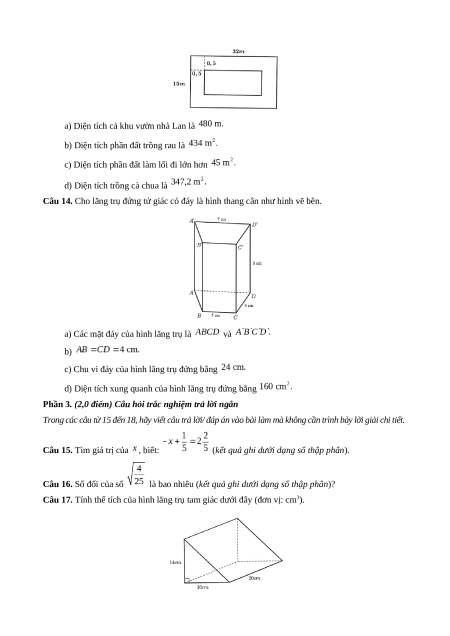 Câu 13. Mảnh vườn nhà bạn Lan hình chữ nhật có kích thước và Mẹ bạn Lan đã bỏ ra mỗi cạnh