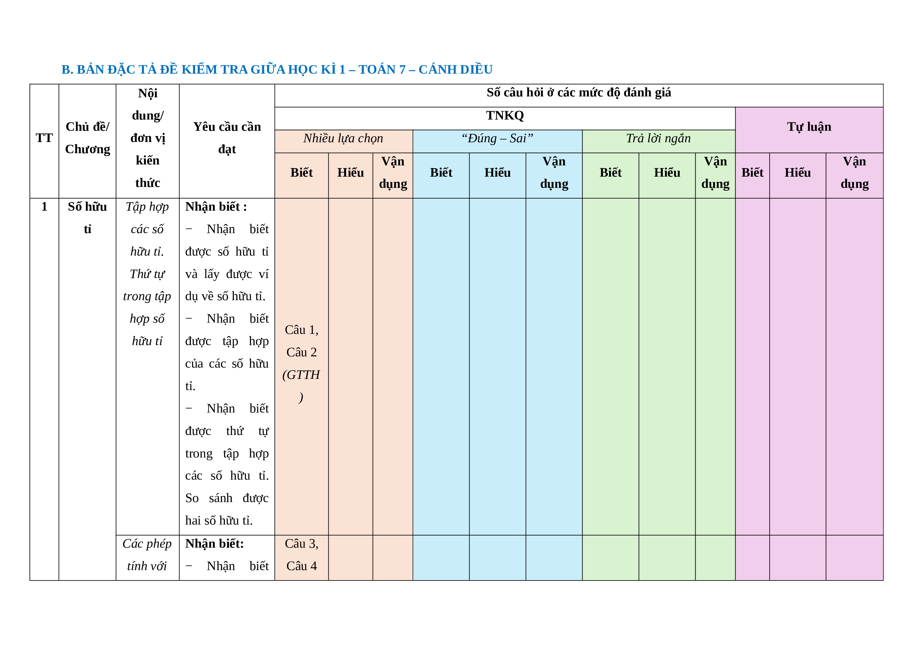B. BẢN ĐẶC TẢ ĐỀ KIỂM TRA GIỮA HỌC KÌ 1 – TOÁN 7 – CÁNH DIỀU Nội