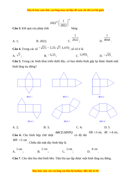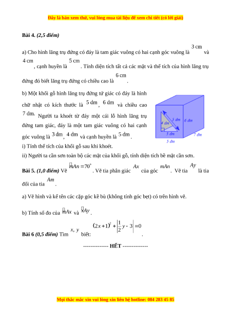 Chu vi đáy của hình lăng trụ đứng đó là: A. ; B. ; C. ; D. . Câu 8. Cho hai góc và kề bù với nhau, biết . Khi đó, số đo bằng A. ; B. ; C. ;