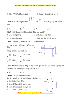 Câu 7. Hình lập phương không có đặc điểm nào sau đây? A. Có 8 đường chéo; B. Có 12 cạnh bằng nhau; B. Có 6 mặt bằng nhau;