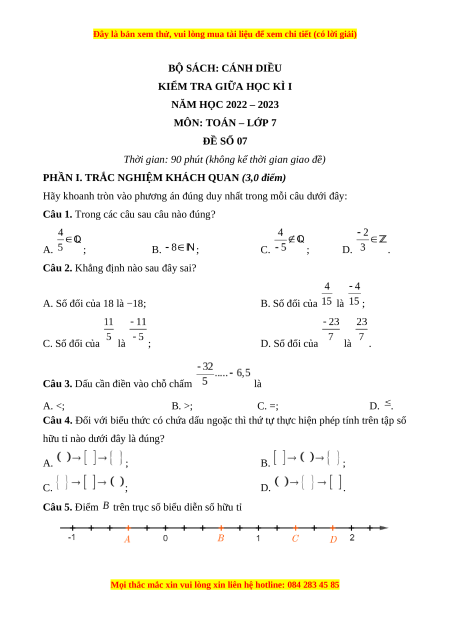 Câu 5. Điểm trên trục số biểu diễn số hữu tỉ