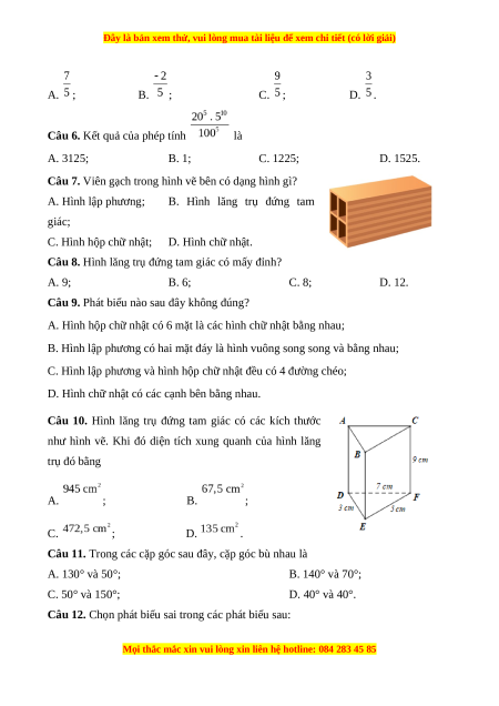 Câu 6. Kết quả của phép tính là A. 3125; B. 1; C. 1225; D. 1525.