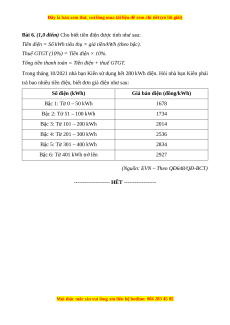 Bài 6. (1,0 điểm) Cho biết tiền điện được tính như sau: