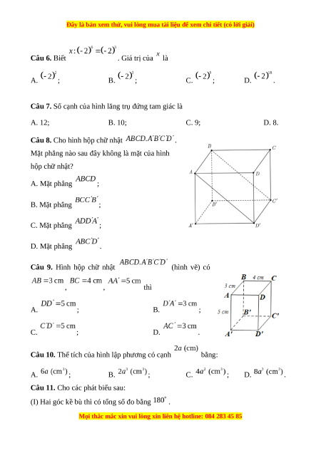 Câu 10. Thể tích của hình lập phương có cạnh bằng: A. ; B. ; C. ; D. .