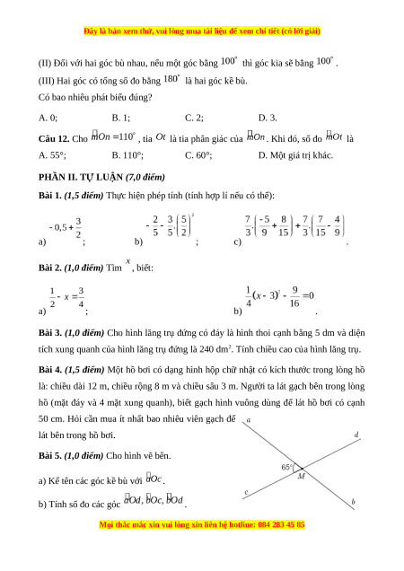 Có bao nhiêu phát biểu đúng? A. 0; B. 1; C. 2; D. 3. Câu 12. Cho , tia là tia phân giác của . Khi đó, số đo là A. 55°; B. 110°; C. 60°; D. Một giá trị khác.