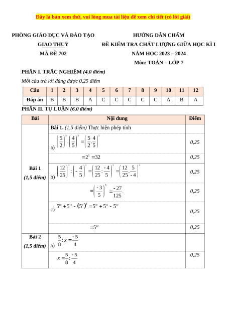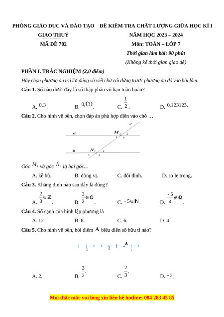 NĂM HỌC 2023 – 2024 MÃ ĐỀ 702 Môn: TOÁN – LỚP 7