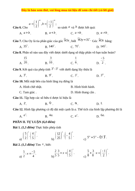 Câu 7. Cho Oy là tia phân giác của góc , biết Góc bằng: A. B. C. D.