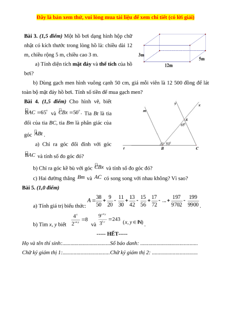 Bài 3. (1,5 điểm) Một hồ bơi dạng hình hộp chữ