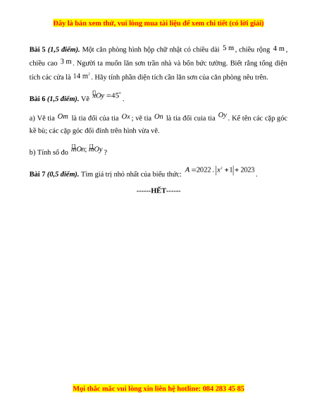 Bài 5 (1,5 điểm). Một căn phòng hình hộp chữ nhật có chiều dài , chiều rộng , chiều cao