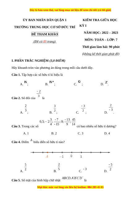 TRƯỜNG TRUNG HỌC CƠ SỞ ĐỨC TRÍ KỲ I ĐỀ THAM KHẢO
