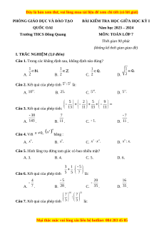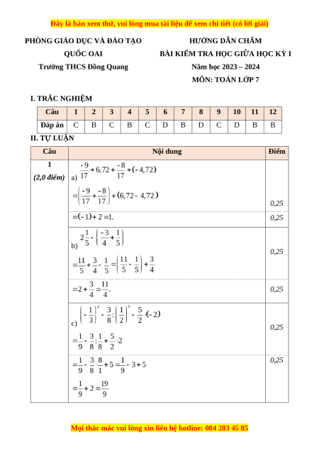 Năm học 2023 – 2024 MÔN: TOÁN LỚP 7 I. TRẮC NGHIỆM Câu 1 2 3 4 5 6 7 8 9 10 11 12 Đáp án C B C B C D B D C D B B II. TỰ LUẬN Câu Nội dung Điểm 1