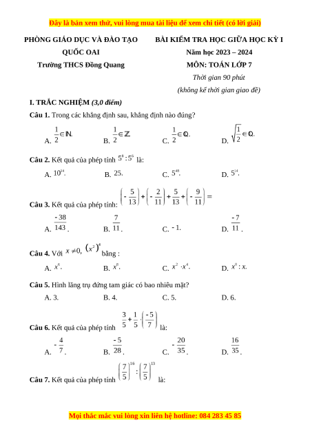 Đề thi giữa kì 1 Toán 7 Cánh diều Trường THCS Đồng Quang – Hà Nội