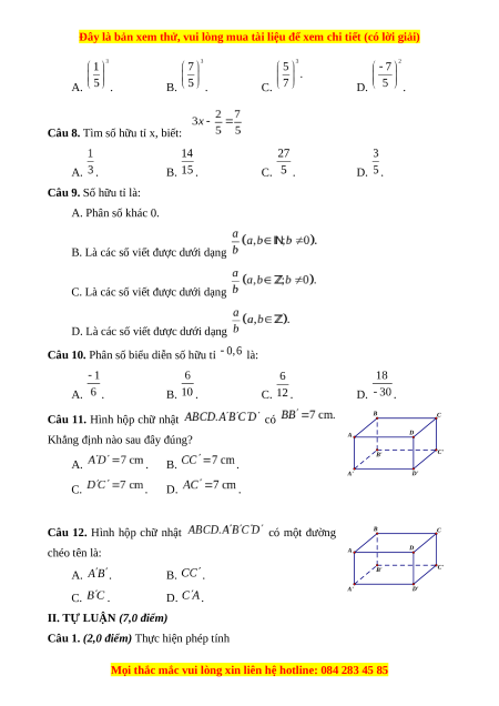 Câu 8. Tìm số hữu tỉ x, biết: A. . B. . C. . D. .
