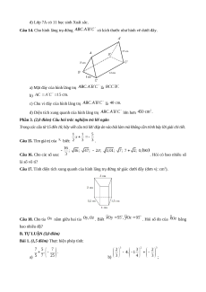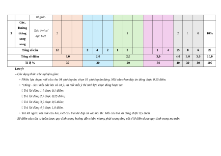 học trực nhật. Hình lập quan phương. Hình lăng trụ đứng tam giác. Hình lăng trụ đứng tứ giác. Góc. Đường Góc ở vị trí 3 thẳng 2 1 2 1 0 10% đặc biệt. song song Tổng số câu 12 2 4 2 1 3 1 4 15 8 6 29 Tổng số điểm 3,0 2,0 2,0 3,0 4,0 3,0 3,0 10,0 Tỉ lệ % 30 20 20 30 40 30 30 100 Lưu ý:
