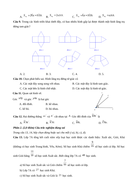 Câu 9. Trong các hình triển khai dưới đây, có bao nhiêu hình gấp lại được thành một hình lăng trụ đứng tam giác? A. 2. B. 3. C. 4. D. 5.