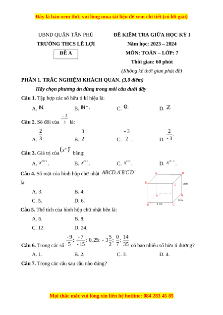 Đề thi giữa kì 1 Toán 7 Chân trời sáng tạo Trường THCS Lê Lợi – TP HCM