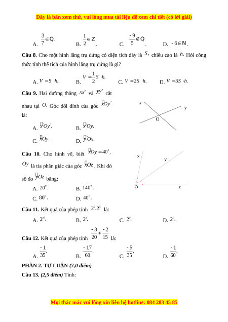 Câu 1. Tập hợp các số hữu tỉ kí hiệu là: A. B. C. D.