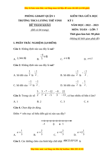 TRƯỜNG THCS LƯƠNG THẾ VINH KỲ I ĐỀ THAM KHẢO