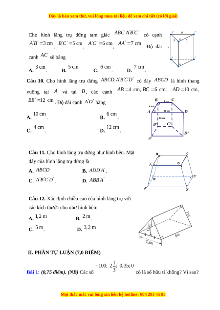 Câu 12. Xác định chiều cao của hình lăng trụ với