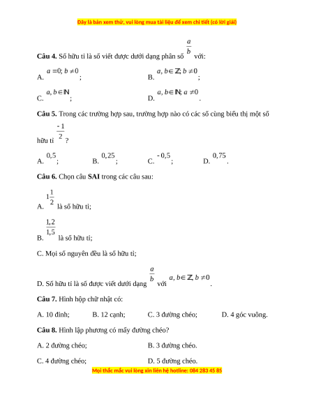 Câu 4. Số hữu tỉ là số viết được dưới dạng phân số với: A. ; B. ; C. ; D. .