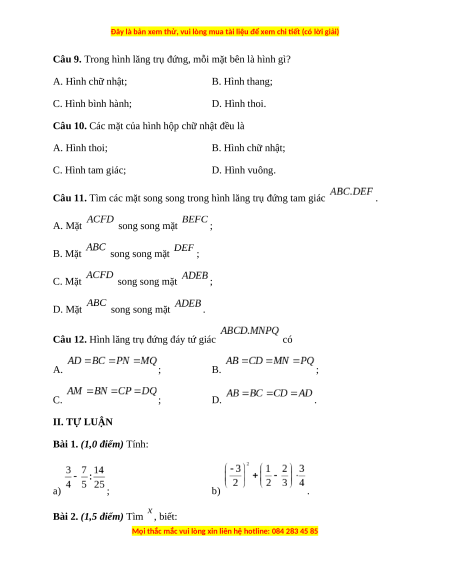 Câu 12. Hình lăng trụ đứng đáy tứ giác có A. ; B. ; C. ; D. . II. TỰ LUẬN