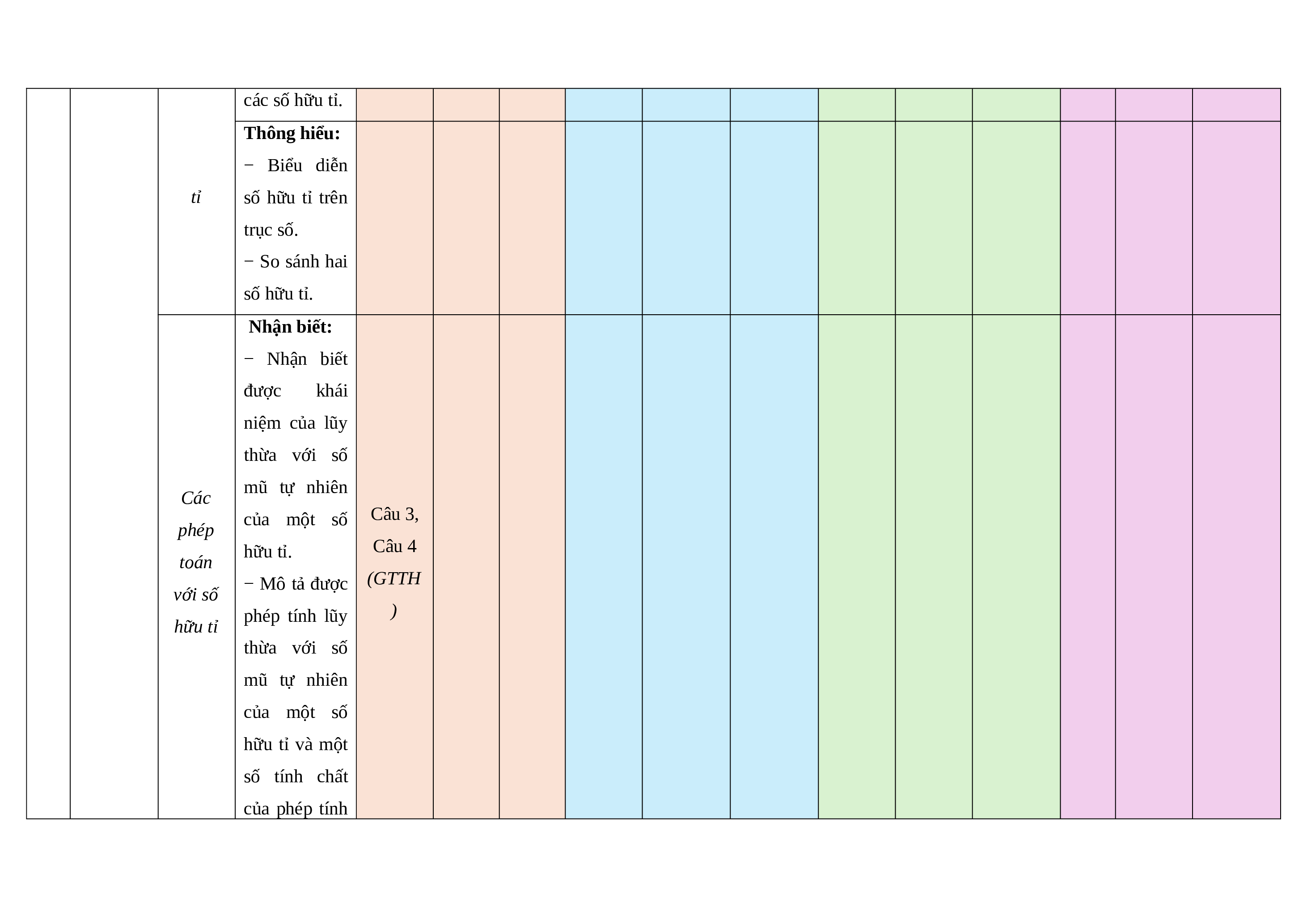 số hữu trong tập hợp  các số hữu tỉ. Thông hiểu: − Biểu diễn  tỉ số hữu tỉ trên  trục số. − So sánh hai  số hữu tỉ.  Nhận biết: − Nhận biết  được khái  niệm của lũy  thừa với số  mũ tự nhiên  Các  của một số Câu 3, phép  hữu tỉ. Câu 4 toán