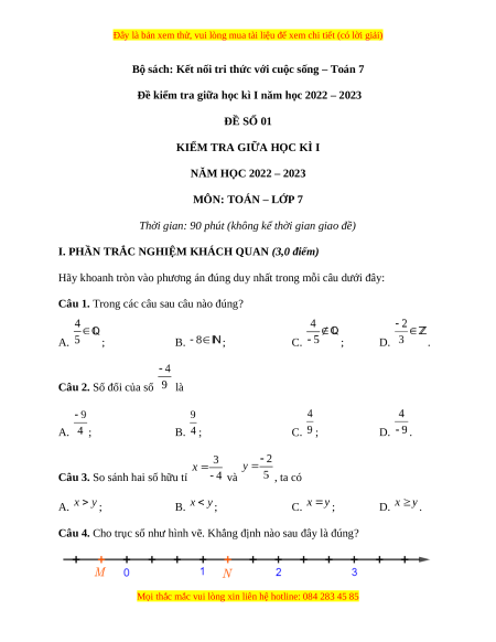 Đề thi giữa kì 1 Toán 7 Kết nối tri thức có đáp án (Đề 1)
