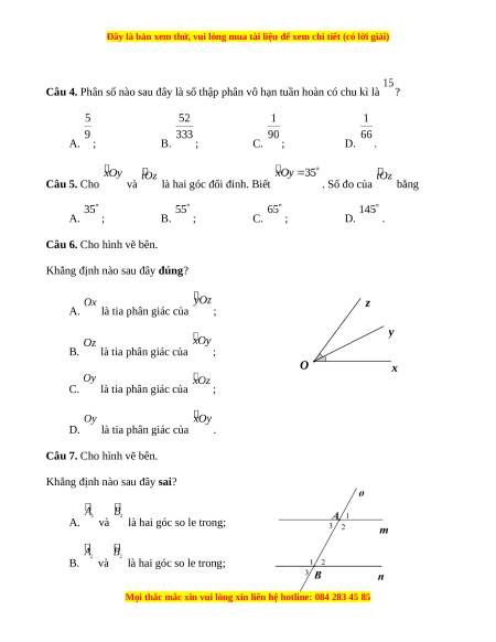 Câu 4. Phân số nào sau đây là số thập phân vô hạn tuần hoàn có chu kì là ? A. ; B. ; C. ; D. . Câu 5. Cho và