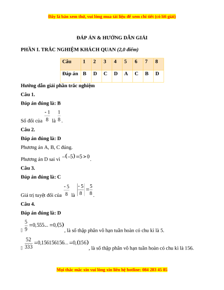 Câu 1. Số đối của là A. –8; B. ; C. ; D. 8.