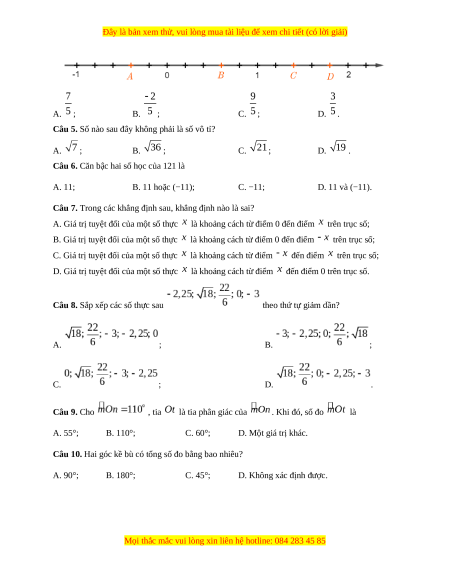 Câu 8. Sắp xếp các số thực sau theo thứ tự giảm dần? A. ; B. ; C. ; D. . Câu 9. Cho , tia là tia phân giác của . Khi đó, số đo là A. 55°; B. 110°; C. 60°; D. Một giá trị khác.
