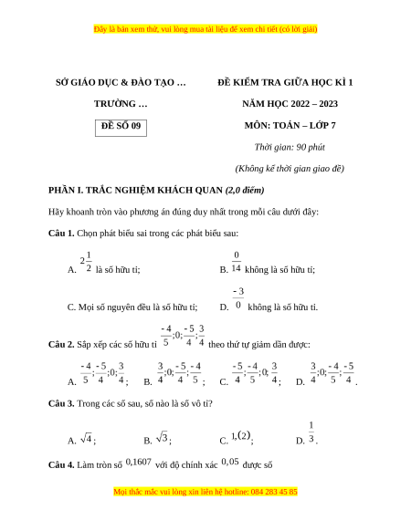 NĂM HỌC 2022 – 2023 ĐỀ SỐ 09 MÔN: TOÁN – LỚP 7 Thời gian: 90 phút
