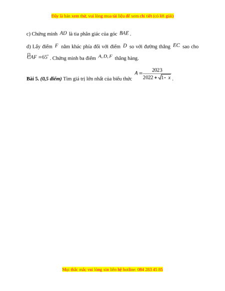 Bài 5. (0,5 điểm) Tìm giá trị lớn nhất của biểu thức .