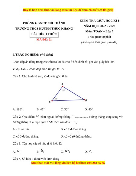 TRƯỜNG THCS HUỲNH THÚC KHÁNG Môn: TOÁN – Lớp 7 ĐỀ CHÍNH THỨC Thời gian: 60 phút MÃ ĐỀ: 01