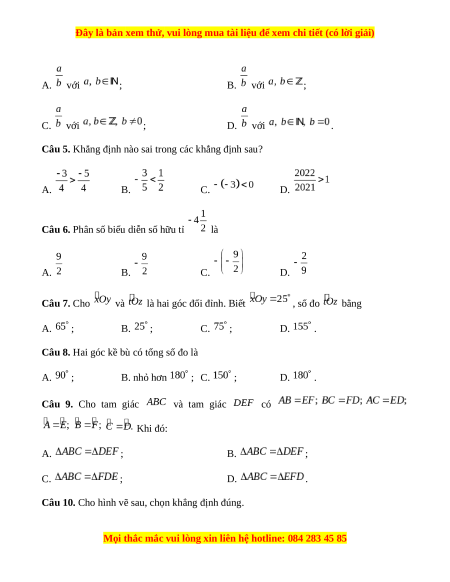 Câu 6. Phân số biểu diễn số hữu tỉ là A. B. C. D. Câu 7. Cho và