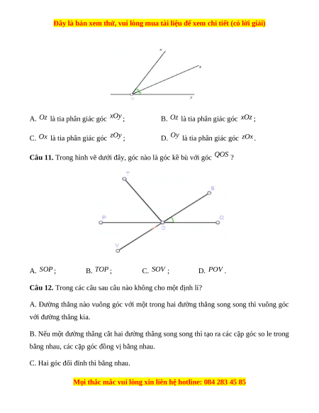 Câu 11. Trong hình vẽ dưới đây, góc nào là góc kề bù với góc ? A. ; B. ; C. ; D. .
