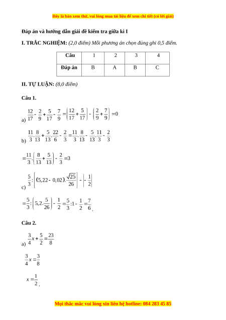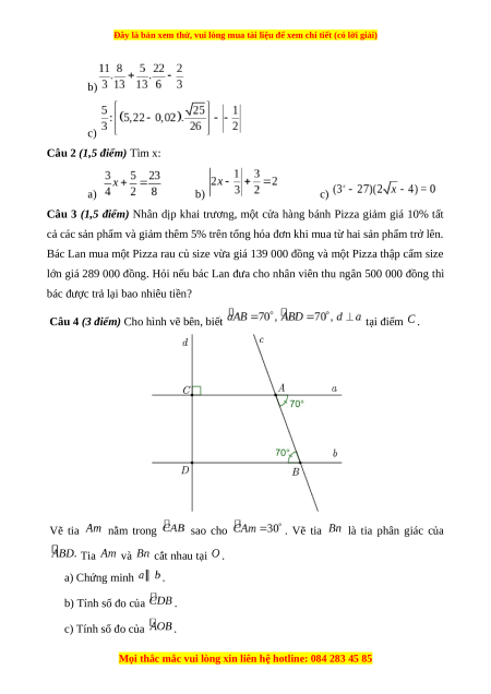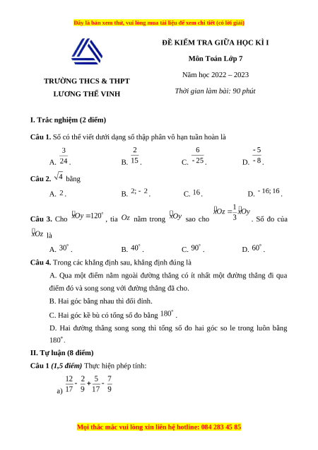 Câu 1. Số có thể viết dưới dạng số thập phân vô hạn tuần hoàn là A. . B. . C. . D. . Câu 2. bằng A. . B. . C. . D. . Câu 3. Cho , tia nằm trong sao cho . Số đo của là A. . B. . C. . D. .