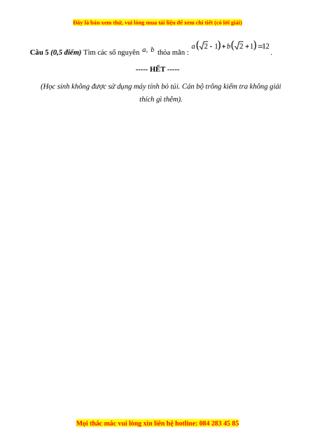 Câu 5 (0,5 điểm) Tìm các số nguyên thỏa mãn : . ----- HẾT -----