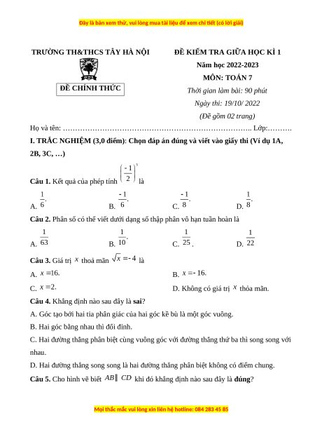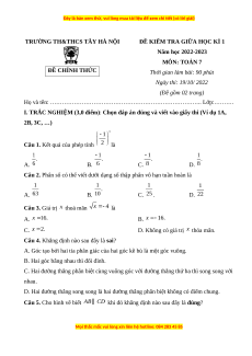 ĐỀ KIỂM TRA GIỮA HỌC KÌ 1 Năm học 2022-2023 MÔN: TOÁN 7 ĐỀ CHÍNH THỨC