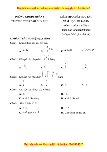 Đề thi giữa kì 1 Toán 7 trường THCS Đào Duy Anh TP Hồ Chí Minh