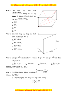 Câu 7. Cho hình lăng trụ đứng như hình dưới. Độ dài cạnh là: A. . B. . C. . D. Câu 8. Cho góc có số đo là . Tính số đo góc biết góc đối đỉnh với góc A. . B. . C. . D. .