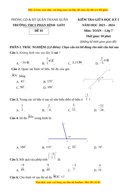 NĂM HỌC 2023 – 2024 ĐỀ 01 Môn: TOÁN – Lớp 7