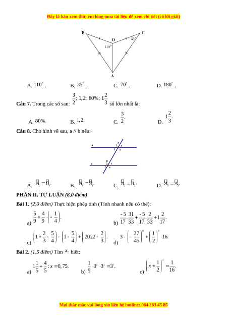 Câu 3. Trong các số hữu tỉ sau số nào biểu diễn số hữu tỉ ? A . . B. . C. . D. . Câu 4. Số đo trong hình là: y 110° z x O A. B. C. D.