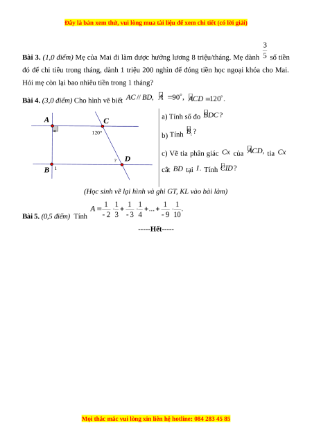 Bài 4. (3,0 điểm) Cho hình vẽ biết A a) Tính số đo C 120° b) Tính c) Vẽ tia phân giác của tia ? D 1 B cắt tại Tính