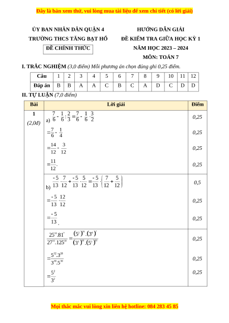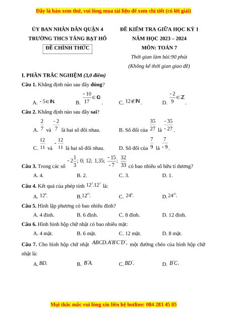 Đề thi giữa kì 1 Toán 7 trường THCS Tăng Bạt Hổ TP Hồ Chí Minh