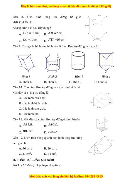 Câu 8. Cho hình lăng trụ đứng tứ giác